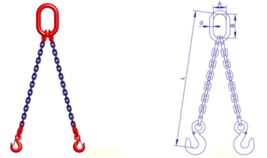 该索具可以作为双肢捆绑索具使用,当双肢捆绑索具使用时只需将吊钩钩入链条, 此时额定载荷将降低20%。